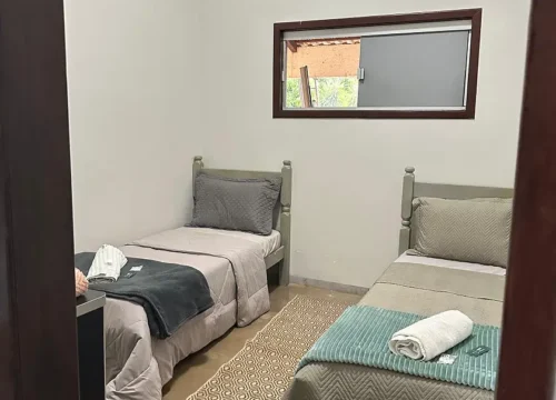 Acomode-se com conforto em um espaço com 2 camas de solteiro, apoio para malas e cabideiro. Desfrute de banheiro privativo equipado com 2 chuveiros quentes e 2 lavatórios. Relaxe na varanda de frente para o jardim, com rede para momentos de descanso.